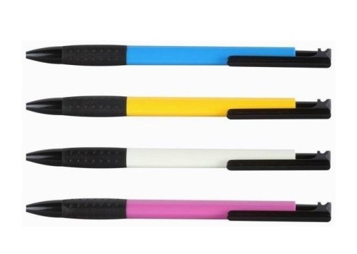 Plastikowy długopis, automatyczny, ergonomiczna obudowa z uchwytem antypoślizgowym, wymienny wkład F-411, niebieski kolor tuszu, grubość linii 0,7 mm, miks kolorów, 50 sztuk w paczce.