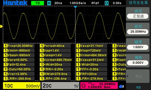 - Pomiar automatyczny: częstotliwość, okres, średnia, peak-to-peak, RMS, minimum, mixmum, czas narastania, czas opadania, + szerokość, - szerokość, podstawa, góra, środek, amplituda, overshoot, preshoot, różnica faz zbocza narastającego, różnica faz zbocza opadającego, + duty, - duty, średnia okresu, PRMS, FOVshoot, ROVshoot, BWIDTH, FRF, FFR, LRR, LRF, LFR, LFF,