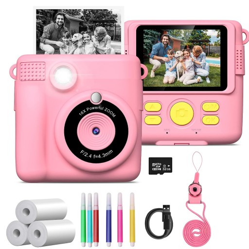 - 🎀 - 【Kompletne akcesoria】: smycz w tym samym kolorze pomaga dzieciom zabrać aparat wszędzie; karty Micro SD 32 GB nie trzeba kupować osobno; a 5 kolorowych ołówków pozwala dzieciom puścić wodze fantazji i kreatywności na drukowanych czarno-białych zdjęciach. Dzięki 3 rolkom certyfikowanego papieru do druku termicznego dzieci mogą błyskawicznie wykonać 200 sztuk zdjęć w aparacie.