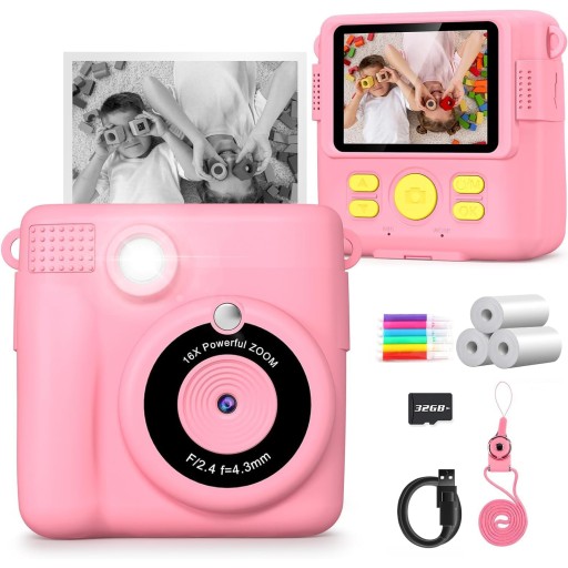 - ten aparat dla dzieci z możliwością natychmiastowego wydruku, dużym ekranem o przekątnej 2,4 cala, wideo 1080P, 16-krotnym zoomem cyfrowym, lampą błyskową, funkcją nagrywania poklatkowego, zdjęciami ciągłymi, grami, ramką filtra, MP3.
