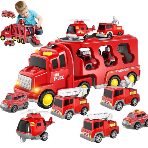 🚒Zaprojektowany dla małych entuzjastów strażaków, zawiera większy pojazd transportowy i 6 małych samochodów (samochód strażacki, ciężarówka z drabiną, helikopter, ciężarówka zraszająca, samochód i SUV).
