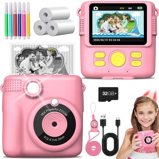 📷Ten aparat dla dzieci umożliwia natychmiastowe drukowanie, duży ekran o przekątnej 2,4 cala, nagrywa wideo w rozdzielczości 1080P, 16-krotny zoom cyfrowy, lampę błyskową, fotografię poklatkową, zdjęcia seryjne, gry, ramki filtrów i pliki mp3.