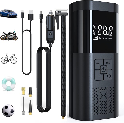 Ta akumulatorowa sprężarka powietrza jest wyposażona w 4 dodatkowe adaptery do pompowania opon samochodowych, motocyklowych, rowerowych, kółek do pływania, kajaków, piłek do gry w piłkę nożną, koszykówek, brodzików, śpiworów, namiotów i innych.
