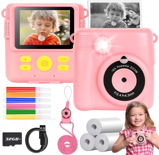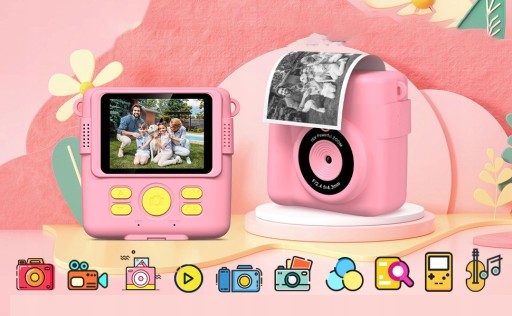 - Ten aparat dla dzieci oferuje natychmiastowe drukowanie, duży ekran o przekątnej 2,4 cala, wideo 1080P, 16-krotny zoom cyfrowy, lampę błyskową, zdjęcia poklatkowe, zdjęcia seryjne, gry, ramki filtrów i pliki MP3.