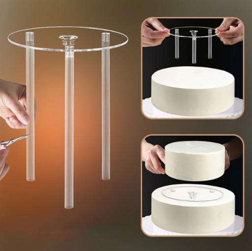 Mocna, bezbarwna podstawka z tworzywa wraz z zestawem 3 wsporników do tworzenia tortów wielowarstwowych.