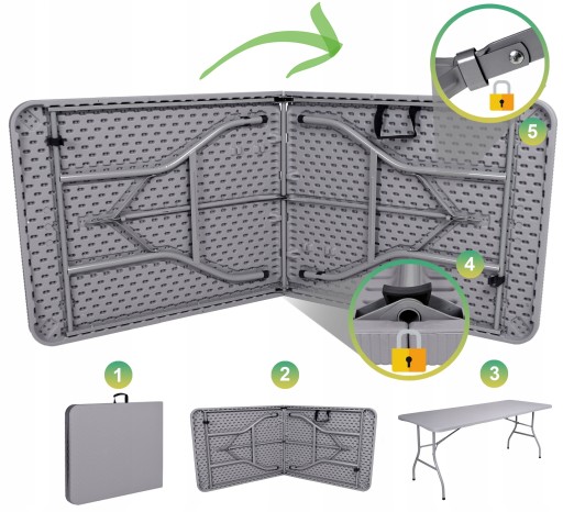 Składany stół cateringowy. Bardzo praktyczny i lekki. Konstrukcja wykonana ze stali malowanej proszkowo. Blat wykonany z polietylenu HDPE. Wzorowany na rattan. Odporny na promienie słoneczne. Dzięki unikalnemu projektowi całość konstrukcji chowa się w blat stołu, zajmując mało miejsca i tworząc ergonomiczną walizkę, łatwą do przenoszenia.