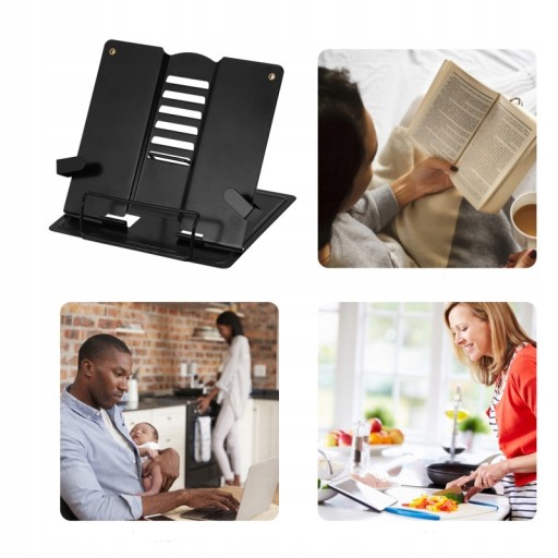 Solidna metalowa półka na książki składa się w zakresie 0-60 stopni i dostosowuje się do sześciu kątów czytania. Może być używany do tabletów, książek kucharskich, podręczników, nut, obrazów, czasopism i innych.