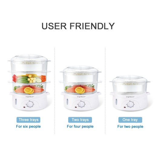 Posiada 3 przezroczyste pojemniki, aby jednocześnie gotować na parze różne potrawy. Każdy pojemnik ma 3 litry. Dodatkowo 1 litrowa miska do przygotowania ryżu i produktów sypkich.