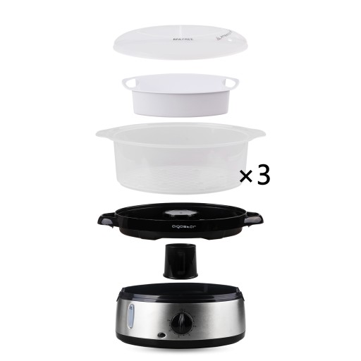 Posiada 3 przezroczyste pojemniki, aby jednocześnie gotować na parze różne potrawy. Każdy pojemnik ma 3 litry. Dodatkowo 1 litrowa miska do przygotowania ryżu i produktów sypkich. Każdy z 3 pojemników posiada wytłoczenia na umieszczenie jajek.