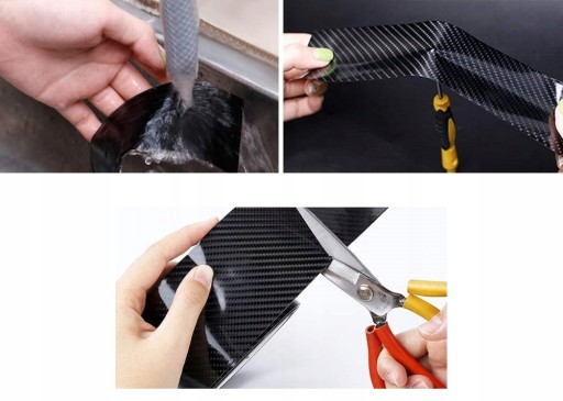 Wysokiej jakości taśma z połyskiem 5d o strukturze imitującym carbon (włókno węglowe) Bardzo dobrze sprawdzi się do zabezpieczania, jak i maskowania uszkodzonych już powierzchni takich jak progi samochodowe, słupki, zderzak pod klapą bagażnika, ranty drzwi itp. Taśma jest samoprzylepna i dwuwarstwowa (z dodatkową folią zabezpieczającą klej). Odporność na warunki atmosferyczne sprawia, że można ją z powodzeniem stosować ją na zewnątrz. Elastyczność i termo plastyczność taśmy pozwala na bezproblemowe dopasowanie nawet do bardzo trudnych i nierównych powierzchni. Zastosowanie specjalistycznego kleju umożliwia dokładne dopasowanie, (brak pęcherzyków) oraz możliwość ponownego odklejenia i poprawienia źle naklejonej folii bez uszkodzeń. Powierzchnia, robocza musi być gładka, oczyszczona z kurzu, smarów oraz innych zanieczyszczeń.