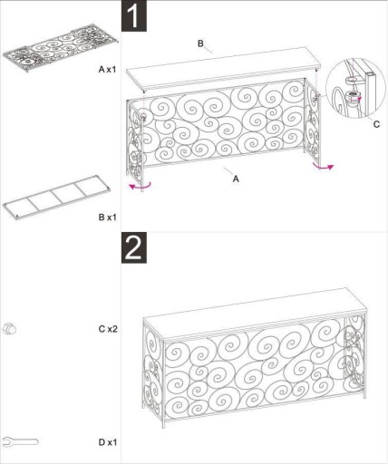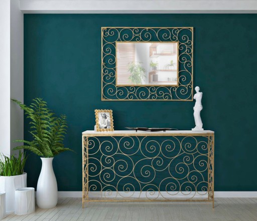 Prostokątna konsola z metalu w kolorze złotym, ozdobiona blatem z białego marmuru. Szczególne i delikatne geometryczne dekoracje dodają wyrafinowania każdemu pomieszczeniu.