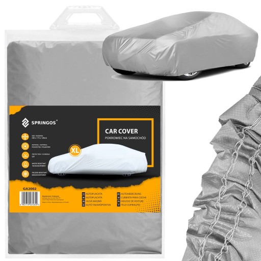 Pokrowiec marki Springos wykonany jest z trwałego i wytrzymałego materiału. Doskonale spisze się zarówno latem pełniąc ochronę przed promieniowaniem UV. nagrzewaniem się wnętrza i zimą podczas niskich temperatur. Plandeka jest bezpieczna dla lakieru i felg.