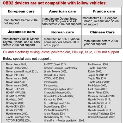 Urządzenie OBD2 nie są kompatybilne z następnymi pojazdami: