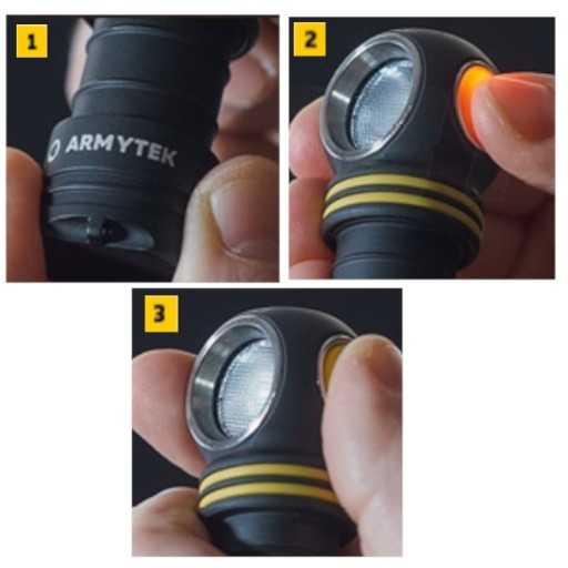 - Odkręć tylną zakrętkę wyłączonej latarki o 1/4, naciśnij przycisk i trzymając wciśnięty, zakręć zakrętkę.