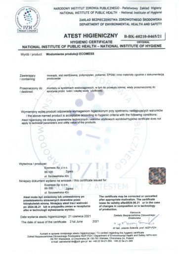 - Atest higieniczny PZH: BK/W/0212/01/2018
