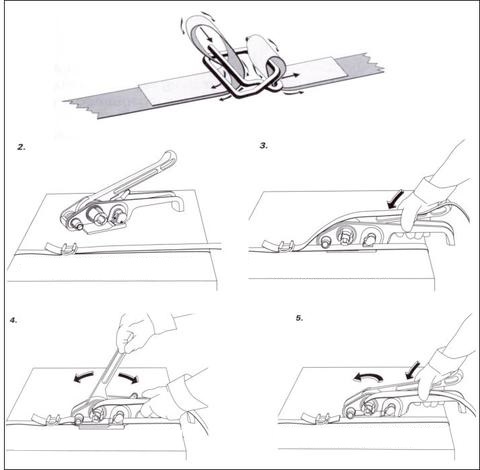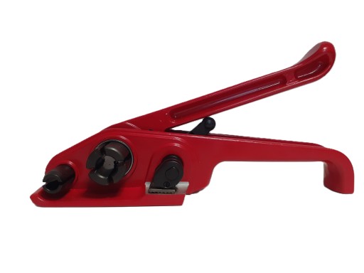 ✅ wyposażony w perforowany docisk taśmy, zapobiegający wyślizgiwaniu się taśmy podczas napinania oraz mechaniczny nóż ucinający taśmę po napięciu.