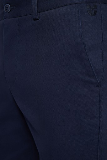 Wszechstronne i ponadczasowe, granatowe chino ze skośnymi kieszeniami z przodu i wpuszczanymi z tyłu zapinanymi na guziki. Uszyliśmy je z wytrzymałej tkaniny o waflowej strukturze, w składzie 97% bawełny i 3% elastanu.