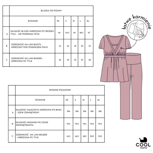 Odcinana pod biustem bluzka od piżamy jest rozszerzana ku dołowi, dzięki czemu będzie się dopasowywać do rosnącego brzuszka w ciąży. Spodnie mają wysoki, elastyczny pas, który zapewni przyszłej mamie wygodę noszenia. Piżama sprawdzi się do karmienia maluszka podczas pobytu w szpitalu i w domu.