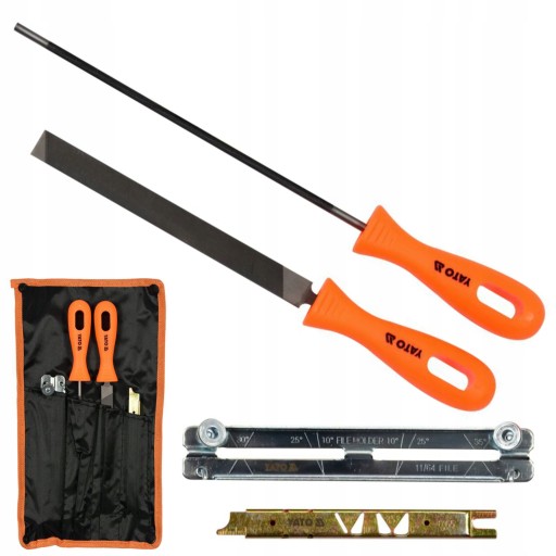 Czteroelementowy zestawy służący do ostrzenia łańcuchów tnących pilarek. W skład zestawu wchodzą: