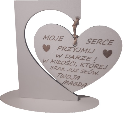 Serce podwieszone na podstawce z wygrawerowanym wierszykiem miłosnym.