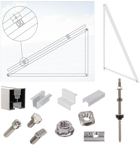 Konstrukcja montażowa umożliwiająca zamocowanie paneli fotowoltaicznych na dachu skośnym pokrytym blachodachówką lub gontem bitumicznym.