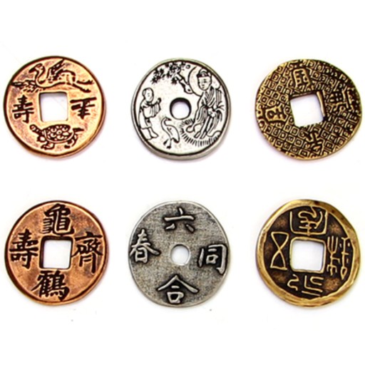 Wykonany ze stopów cynku zestaw 3 cudownych, ciężkich monet które zostały zainspirowane dalekowschodnią kulturą.