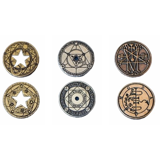 Wykonany ze stopów cynku zestaw 3 cudownych, ciężkich monet zainspirowanych magicznymi kręgami, pieczęciami i przywołaniami.
