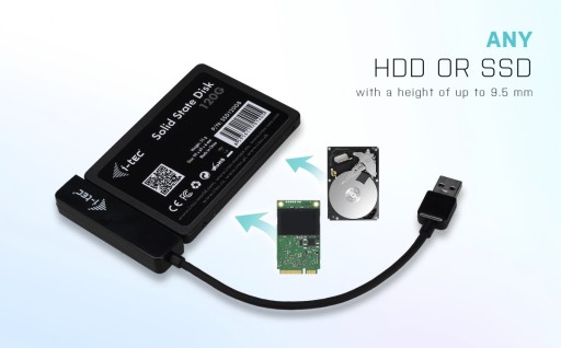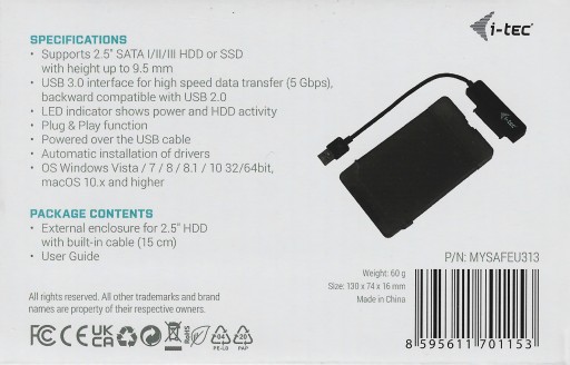 i-tec MySafe USB 3.0 Easy jest obudową zewnętrzną do podłączenia dysków 2,5 " SATA o wszystkich pojemnościach do komputera PC, notebooka, telewizora lub innego urządzenia multimedialnego za pośrednictwem interfejsu USB, poprzez który jest również zasilana. Podłączenie poprzez port USB 3.0 oferuje łatwy przesył danych oraz wysoką prędkość transferu danych (do 5 Gbps). Standardowo obudowa jest kompatybilna wstecz z USB 2.0.