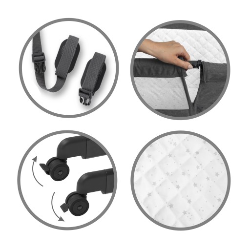 Maksymalne obciążenie łóżeczka 9 kg Możliwość dostawienia do łóżka rodzica, 7-poziomowa regulacja wysokości, Regulacja kąta nachylenia łóżeczka, Otwierana ściana boczna, Materac ze zdejmowaną poszewką, 4 Kółka transportowe z blokadą, Regulowane pasy montażowe do połączenia z łóżkiem rodzica