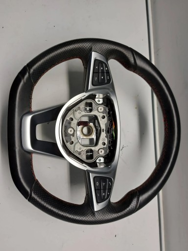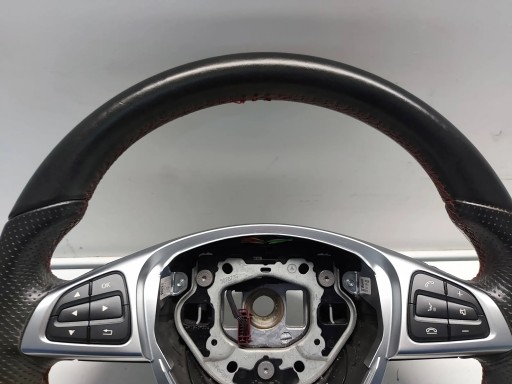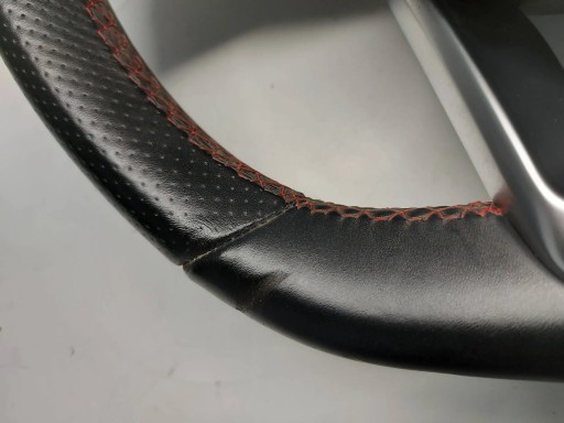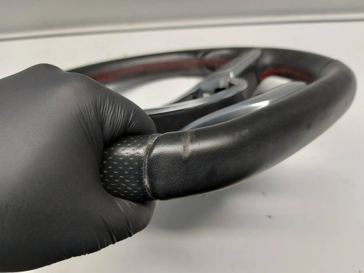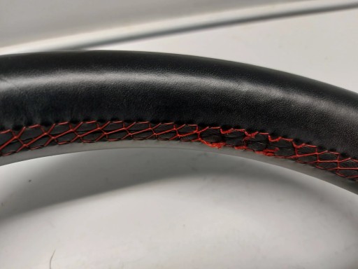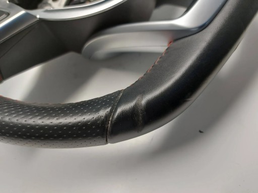 Kierownica do Mercedes A klasa W176 AMG, w dolnej części widoczne zagniecenie oraz delikatnie postrzępione nitki w górnej części
