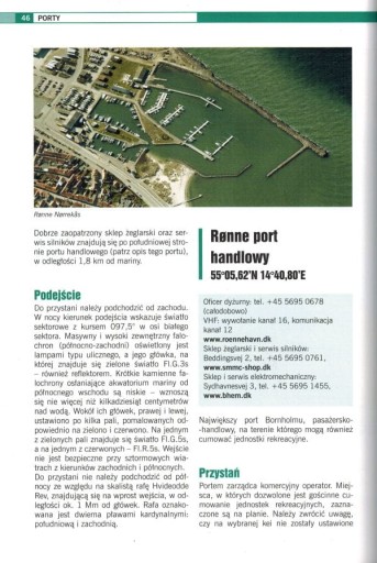 Pierwsza tak wyczerpująca publikacja o przystaniach duńskich na Wyspie Bornholm i w południowo-zachodniej części Bałtyku. Czytelnik znajdzie tu locję (oznakowanie, głębokości, współrzędne geograficzne, instrukcje nawigacyjne), a także informacje dotyczące: opłat, warunków postoju, dostępnych urządzeń i udogodnień, stacji paliw, fachowców i sklepów żeglarskich, służb ratowniczych i administracji morskiej, atrakcji turystycznych i historii miejscowości.
