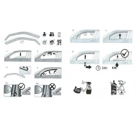 Owiewki są wciskane pod uszczelkę. Posiadają samoprzylepne taśmy oraz komplet klipsów mocujących. Ilość klipsów i ich materiał wykonania zależy od marki i modelu samochodu.