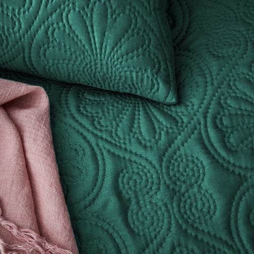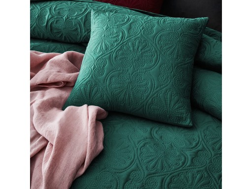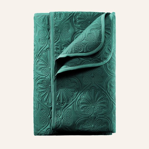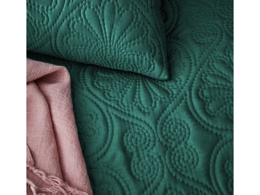 Ciemnozielona narzuta na łóżko Leila. Estetyka kolekcji subtelnie lawiruje pomiędzy stylami, wyróżnia ją ponadczasowość i wysublimowany design. Delikatnie pikowane detale tworzą piękny, ornamentowy wzór, który z gracją ożywia monochromatyczne wnętrze. Gładka, matowa tkanina narzutą zdobiona lamówką, łączy w sobie harmonię i komfort, tworząc przytulną przestrzeń w której dobrze się wypoczywa. Narzuta posiada olbrzymi potencjał aranżacyjny, zawiera w sobie bogate spektrum barw - od spokojnych kolorów z nutą ciepła po głębokie, wyraziste tony.
