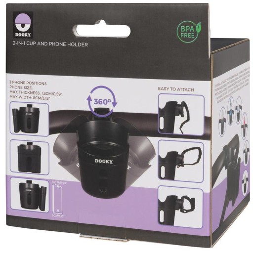 Uchwyt na kubek i telefon Dooky 2 w 1 to uniwersalny uchwyt, dzięki czemu ulubiony napój i telefon są w zasięgu ręki.