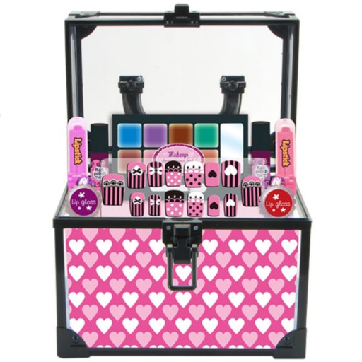 Zestaw kuferka z cieniami do oczu, błyszczykami, lakierami, tipsami na paznokcie i pierścionkami to idealna zabawka dla każdej małej artystki.