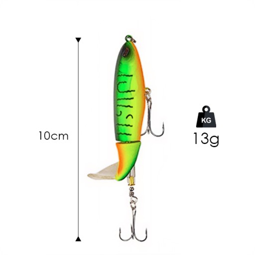 Wobler wyposażony jest w obrotową płetwę, która generuje unikalne i atrakcyjne dla ryb drgania na powierzchni wody. Dodatkowo, wbudowana grzechotka emituje wysokie częstotliwości, przyciągając uwagę drapieżników nawet na duże odległości.