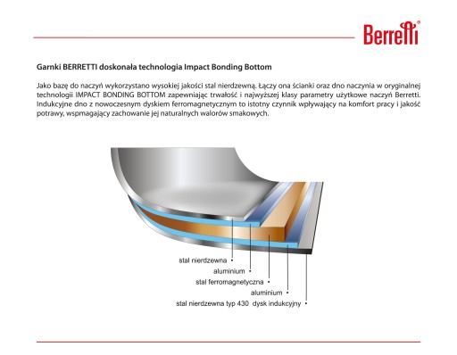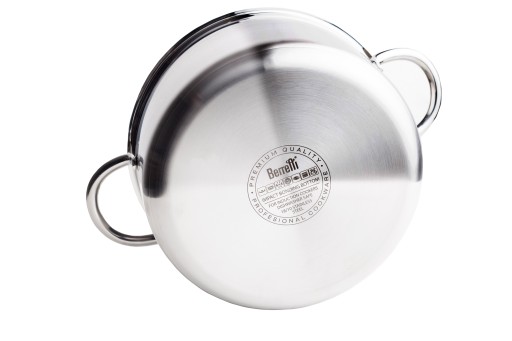 Dzięki tak grubemu dna wykonanego z wysokiej jakości materiałów oraz użycia technologii IMPACT BANDING BOTTOM, daje pewność i jakość wykonania produktu. Dzięki takiej budowie dna naczynie równomiernie rozprowadza ciepło oraz nagrzewa naczynie.