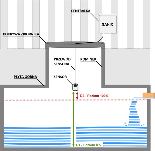 - Montaż sensora: bezkontaktowo, wewnątrz zbiornika