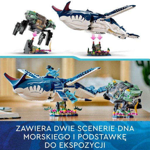 - Co jest w pudełku? – Zestaw zawiera ruchomego tulkuna, podwodnego mecha-kraba, dwie scenerie dna morskiego i podstawkę do ekspozycji, a także minifigurki Lo’aka, Tsireyi i pilota mecha