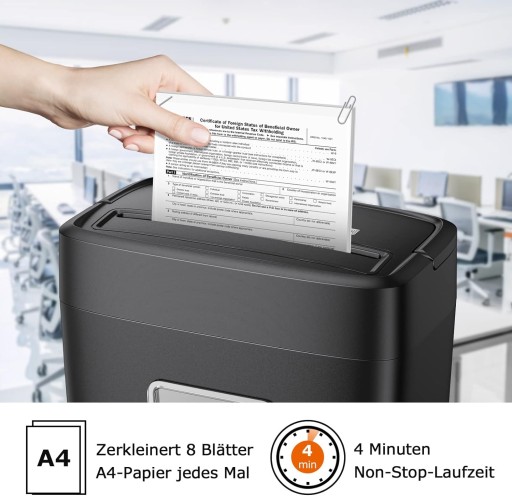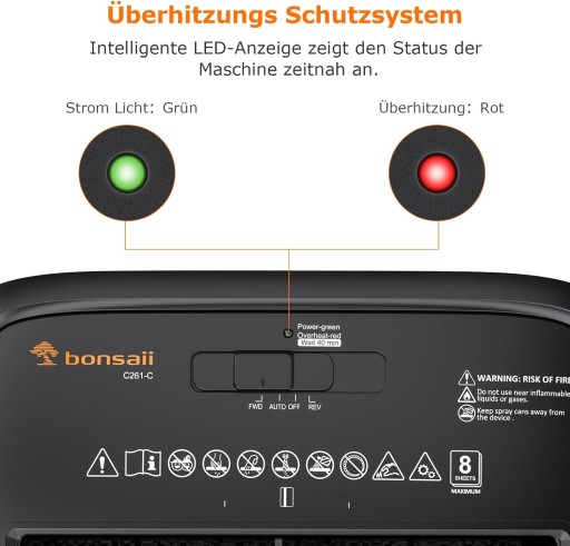 Domowa niszczarka do papieru Bonsaii może jednocześnie zniszczyć do 8 arkuszy papieru i jest również w stanie zniszczyć zszywki i spinacze biurowe oraz pojedyncze karty kredytowe.