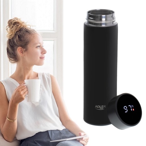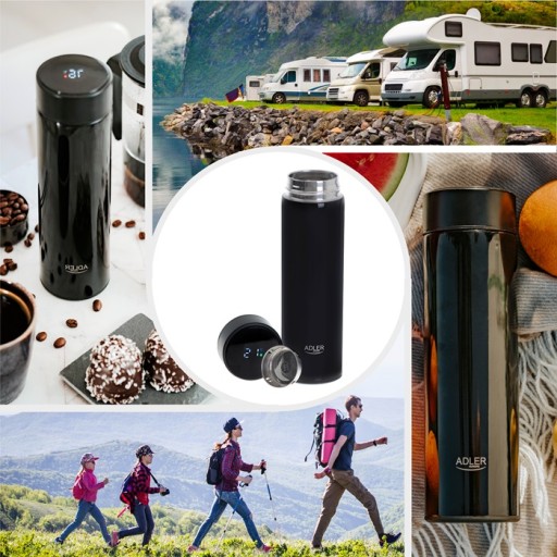 Termos próżniowy o pojemności 473ml AD4506 marki ADLER z wyświetlaczem dotykowym LED, wskazuje aktualną temperaturę zawartości termosu bez konieczności otwierania go. Wyświetlacz LED umożliwia precyzyjne odczytywanie temperatury, co pozwala uniknąć poparzeń lub picia zbyt zimnych napojów. Dodatkowo dotykowy wyświetlacz sprawia, że obsługa termosu jest łatwa i intuicyjna. Urządzenie posiada precyzyjny czujnik termiczny – odczyt temp. po odwróceniu do góry dnem na 3 sekundy. Izolacja próżniowa oraz podwójne ścianki utrzymują temperaturę dla napojów gorących 8 godzin lub zimnych do 12 godzin. W zestawie znajduje się sitko separujące fusy. Wbudowana bateria wyświetlacza LED ma bardzo długą żywotność do 30.000 dotknięć. Ten nowoczesny termos to nie tylko praktyczne urządzenie, ale również stylowy dodatek wykonany z dbałością zarówno o estetykę jak i odporność na czynniki zewnętrzne. Średnica produktu pasuje do większości uchwytów samochodowych i rowerowych
