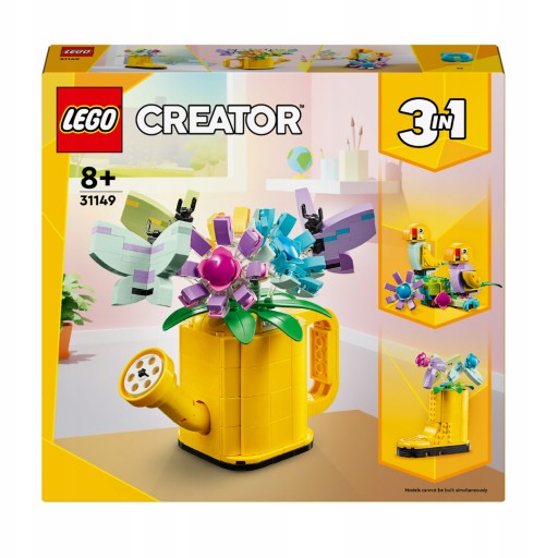 Prezentowany przed Państwem produkt to LEGO creator kwiaty w konewce. Zawiera on żółtą konewkę zbudowaną z klocków z uchwytem i dzióbkiem. W środku są trzy kwiaty z ruchomymi płatkami i trzema motylami na przezroczystych elementach, dzięki czemu stwarzają wrażenie, że latają w powietrzu. Chłopcy i dziewczynki w wieku od ośmiu lat mogą przebudować zabawkę, tworząc żółty klosz wypełniony trzema kwiatami z ruchomymi płatkami lub dwa urocze żółte ptaszki na kwiecistej żerdce.