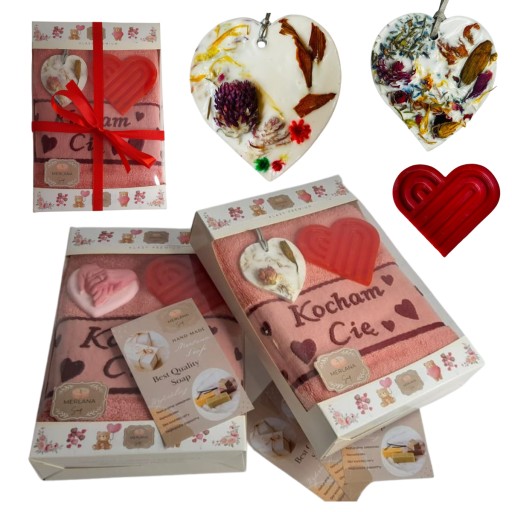- Na zestaw składają się trzy wspaniale pachnące, różane mydełka glicerynowe w kształcie serca oraz ręcznik z haftem.