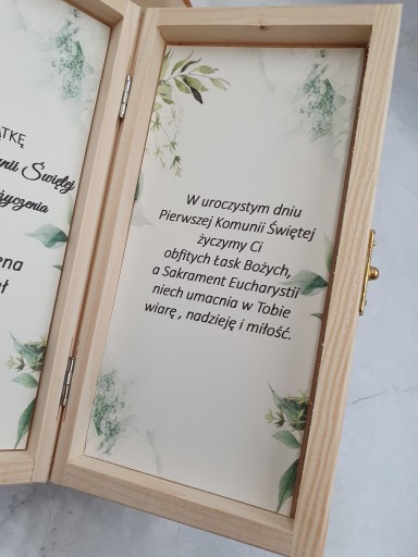 Pudełko zawiera imię dziecka jak i również osób wręczających prezent. Do wyboru maja Państwo również dużą ilość życzeń. Można przesłać własne.