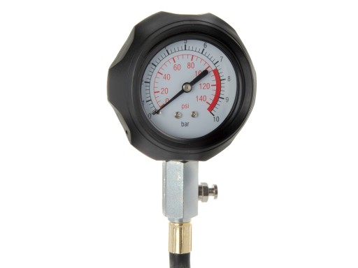 Zestaw wielu adapterów pozwoli na dobranie odpowiedniej końcówki. Manometr posiada gumowa osłonę co chroni go przed uszkodzeniem po upadku. Tester posiada długi elastyczny wąż.