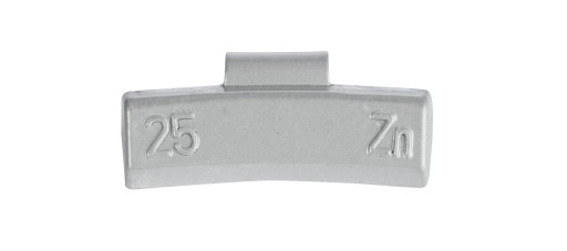 Ciężarki nabijane do felg aluminiowych o gramaturze 25 gram, wykonane z cynku (ZN) zabezpieczone polimerową powłoką ochronną w kolorze szarym. Ciężarki montuje się na obręcz poprzez nabicie na felgę przy pomocy specjalnych kleszczy do ciężarków. Stabilne osadzenie na obręczy gwarantuje precyzyjnie dobrana sprężynka. Ciężarki posiadają elegancki kształt dzięki czemu idealnie przylegają do krawędzi kołnierza felgi. Opakowanie zawiera 100 szt ciężarków. Ciężarki ZN spełniają wymogi prawne Dyrektywy 2005/673/WE, dlatego ciężarki cynkowe to idealna alternatywa dla ciężarków nabijanych wykonanych z ołowiu.