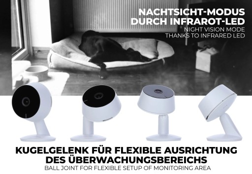 Również montaż kamery monitorującej jest prosty i bezpośredni. Po znalezieniu odpowiedniego miejsca zapewniającego możliwie największe pokrycie monitorowanego obszaru, można łatwo przymocować kamerę do ściany za pomocą dołączonej dwustronnej taśmy samoprzylepnej . dzięki elastycznemu przegubowi kulowemu Kamerę można następnie regulować w dowolnym kierunku, aby dopasować ją do własnych upodobań. Wymagany kąt widzenia .