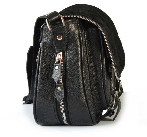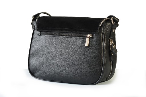 Średniej wielkości skórzana torebka damska w kolorze czarnym, ozdobiona subtelnymi detalami. Zamykana na suwak, posiada praktyczne przegródki wewnątrz. Doskonała na różne okazje.