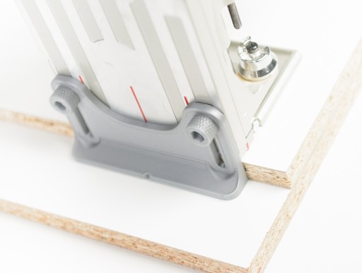 Drukowana przykładnica kątowa z serii LamelMate™, która na wzór rozwiązania zastosowanego w oryginalnej frezarce Lamello (przykładnica 251044) umożliwi frezowanie lamelownicą BOSCH BOSCH GFF 22 A w pozycji pionowej oraz blisko krawędzi płyty.