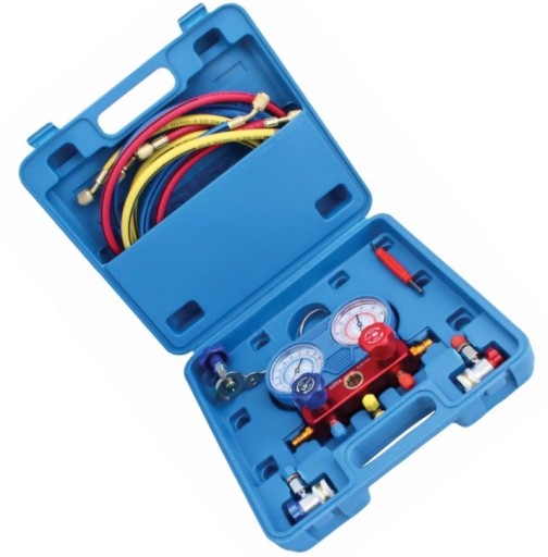 - Zestaw testowy klimatyzacji jest standardowo wyposażony w 3 kolorowe węże o długości 150 cm i zestaw szybkozłączy.